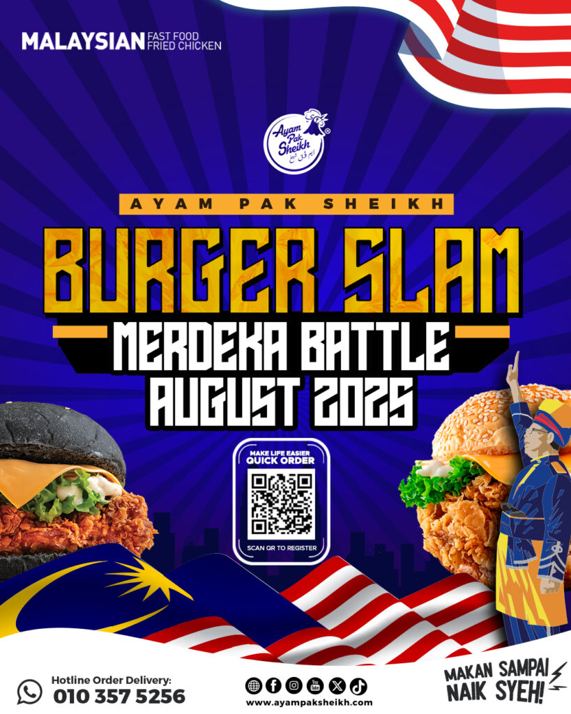 Jangan lepaskan peluang hebat ini – rasai sendiri kehangatan Burger Slam Merdeka Battle 2025 di semua cawangan Ayam Pak Sheikh. Pastikan anda datang dengan semangat Merdeka, kerana bukan sahaja makanan enak menanti anda, malah tawaran jimat yang sukar ditandingi.